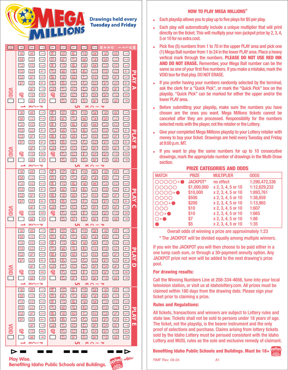Each play costs $5 and will automatically include a unique multiplier that will print directly on the ticket. This will multiply your non-jackpot prize by 2, 3, 4, 5 or 10 for no extra cost. Pick five numbers between 1 and 70. Pick one Mega Ball number between 1 and 24. If you’d like random numbers, ask for a quick pick. Multi-draw tickets can be produced for up to 10 consecutive draws. Drawings are Tuesday and Friday at 9:00 pm MT.