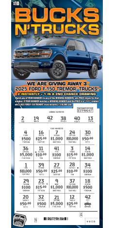 Enter any non-winning Bucks n Trucks scratch ticket for a chance to win a 2025 FORD F-150 TREMOR® truck to be awarded at the official end of the game plus $10,000 cash.