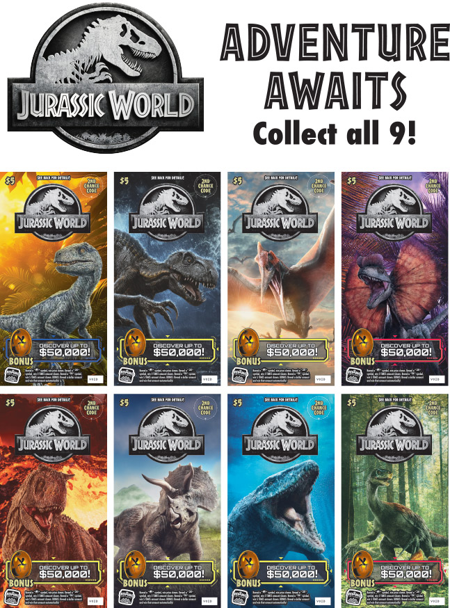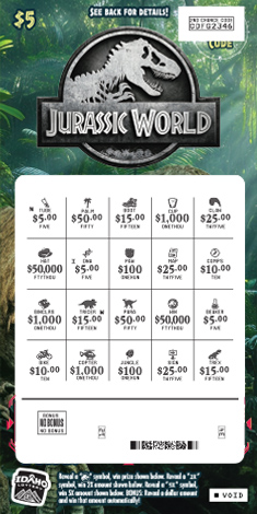 Reveal a "JURASSIC WORLD" symbol, win prize shown. Reveal a "2X" symbol, win 2 TIMES amount shown. Reveal a "5X" symbol, win 5 TIMES amount shown.